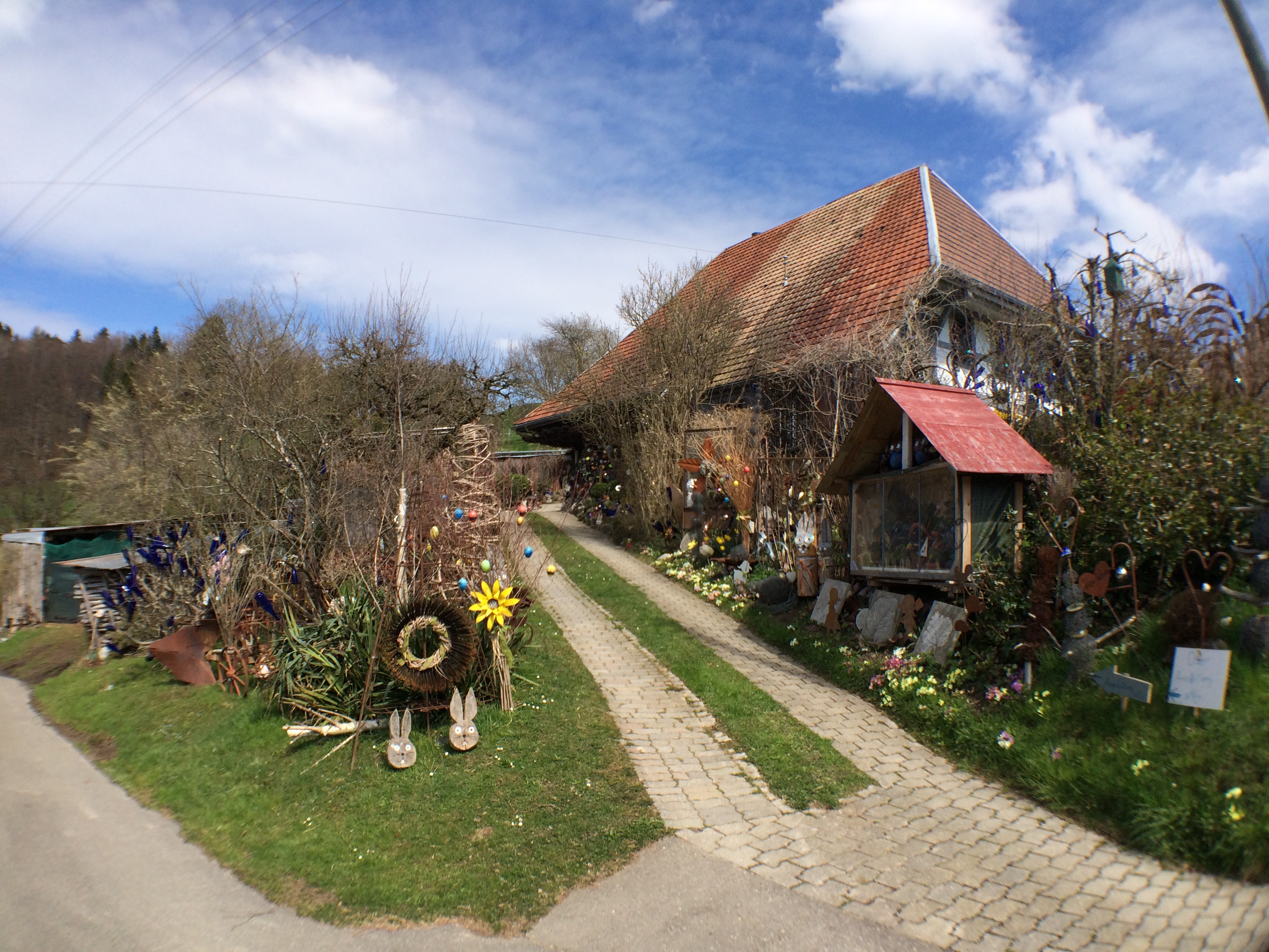 Easter house Published April 7, 2015 at 3264 × 2448 in April 6: Walking the favourite new path again ← Previous Next → On the first walk this was a Christmas house, but now it has an Easter exhibition … which is quite OTT …